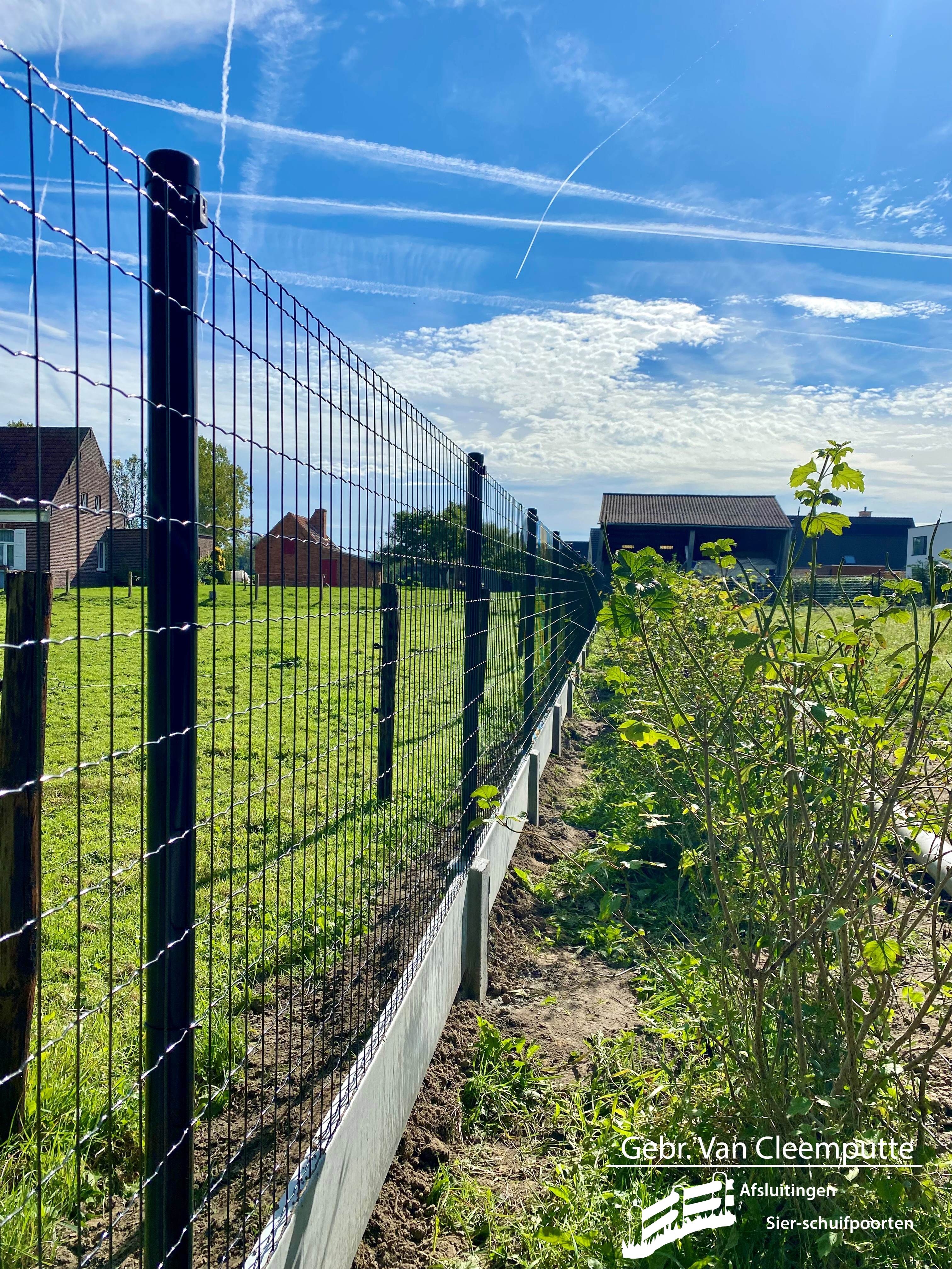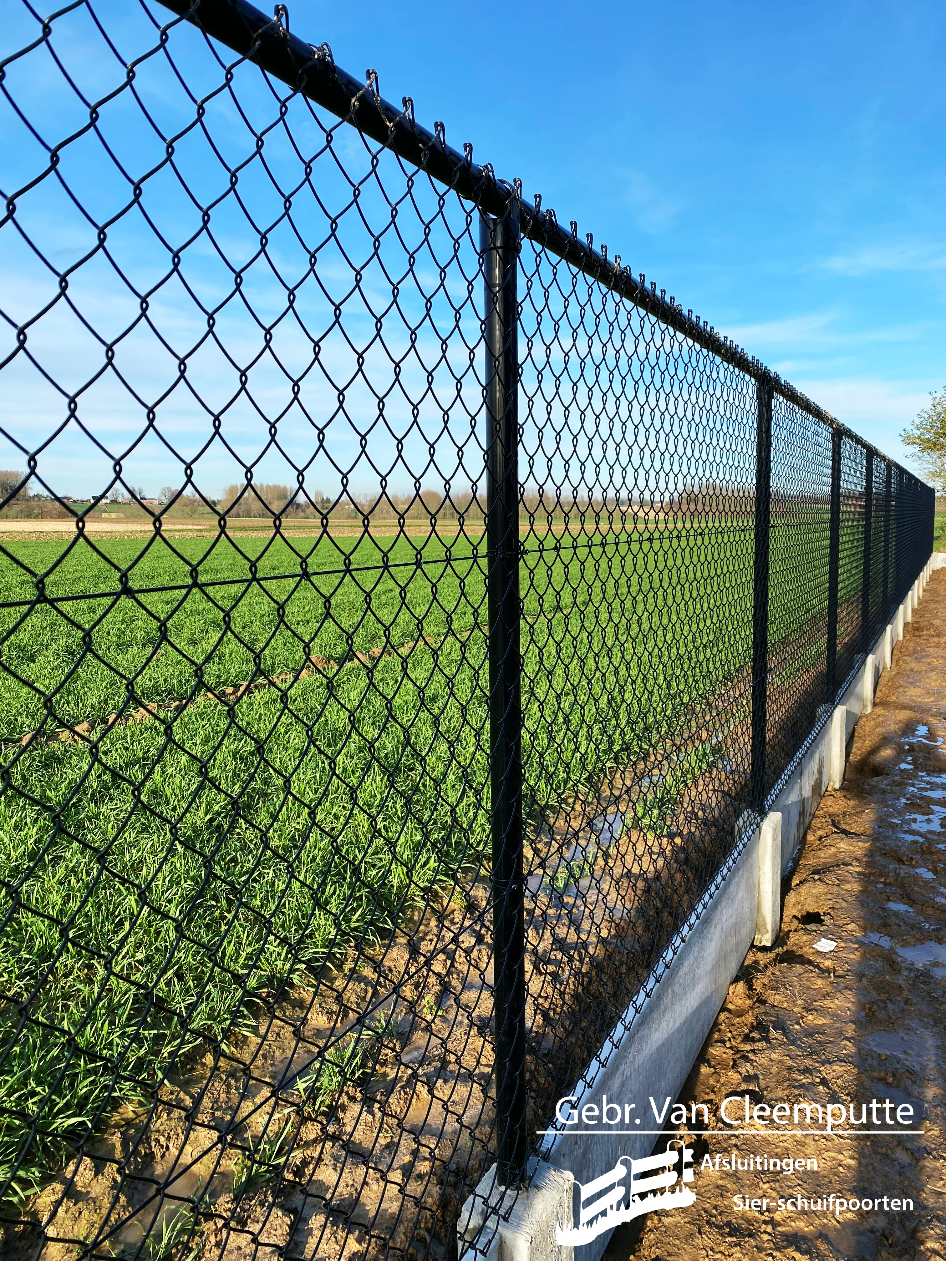 Zwart palen systeem met onderplaat voorzien van pantanet Family draad. Afgewerkte hoogte +/- 1.90 meter.